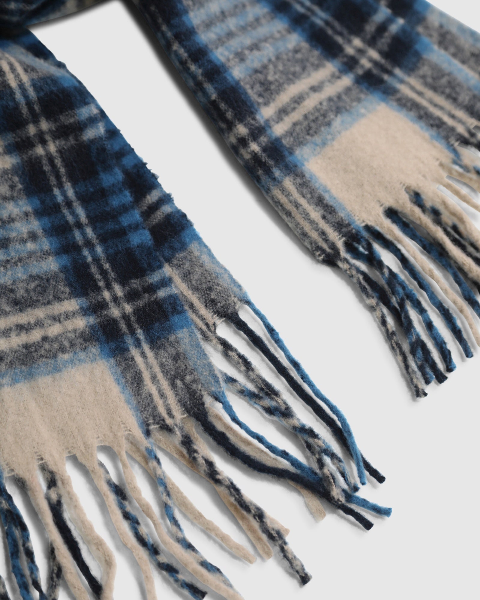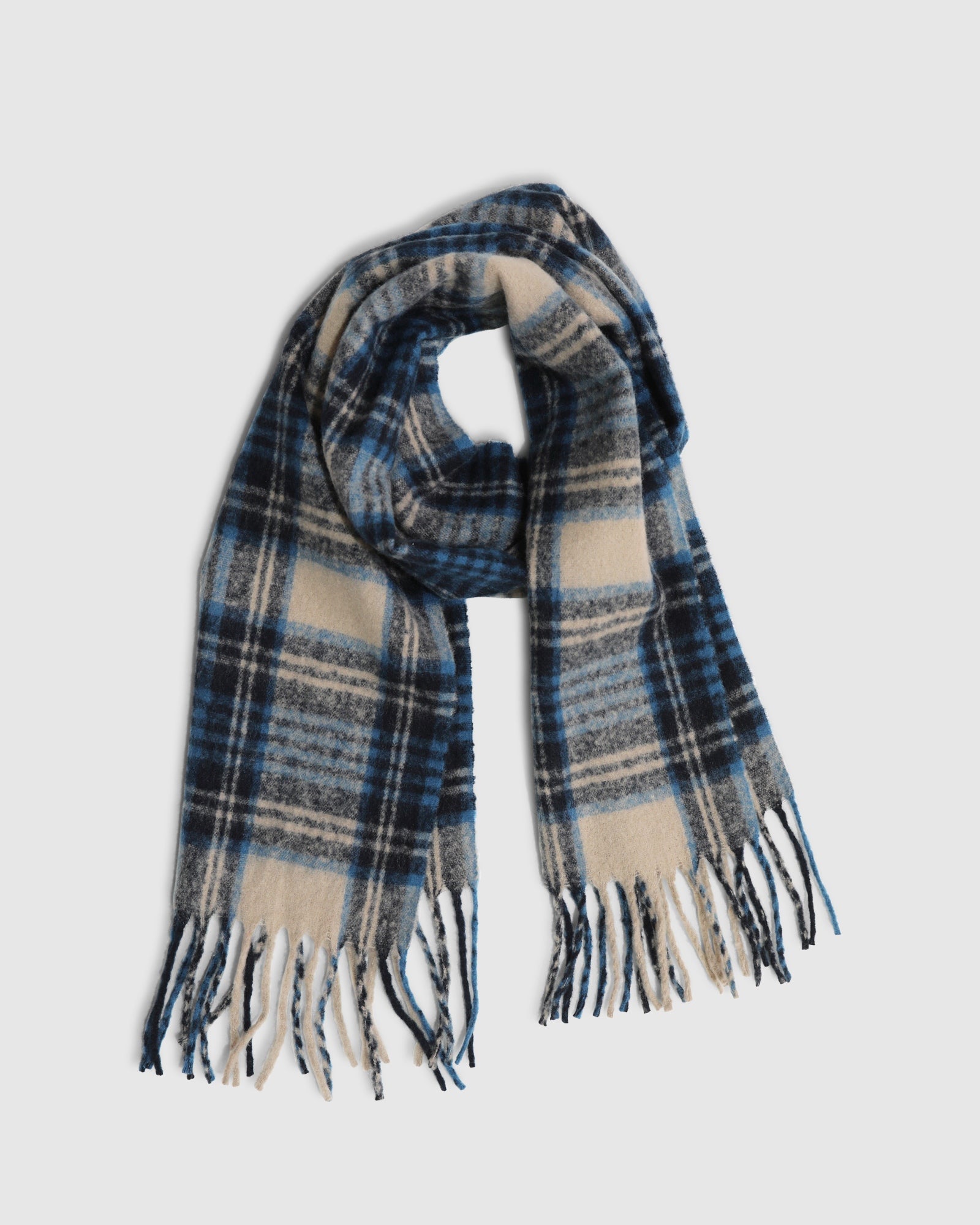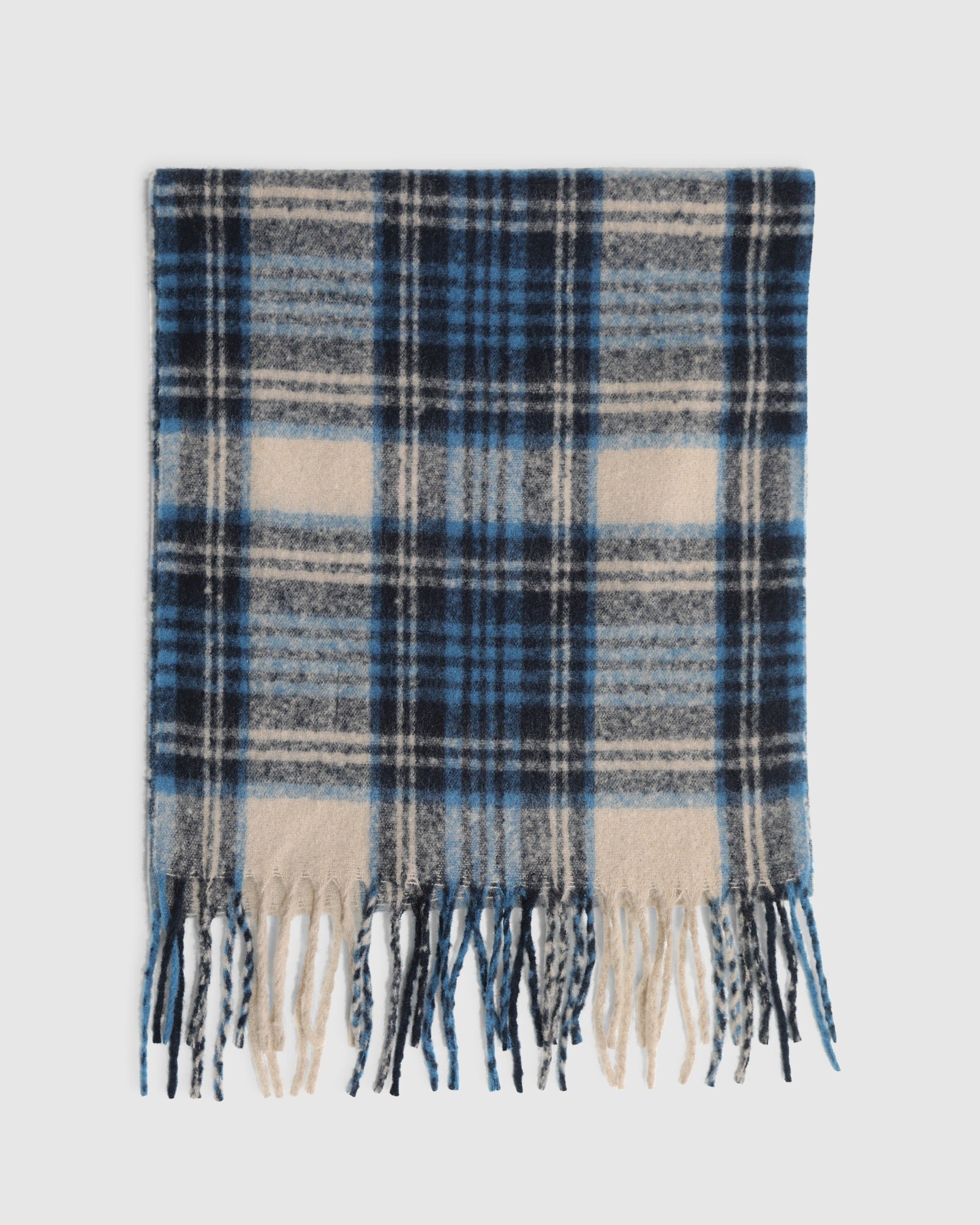 A cool and cozy essential designed to elevate your cold-weather wardrobe. Featuring a classic plaid pattern in shades of blue, from deep navy to soft, tranquil light blue, with a subtle touch of light beige. This ultra-soft knit scarf is finished with delicate fringe for a timeless, sophisticated touch. Perfect for adding warmth and style to any outfit.