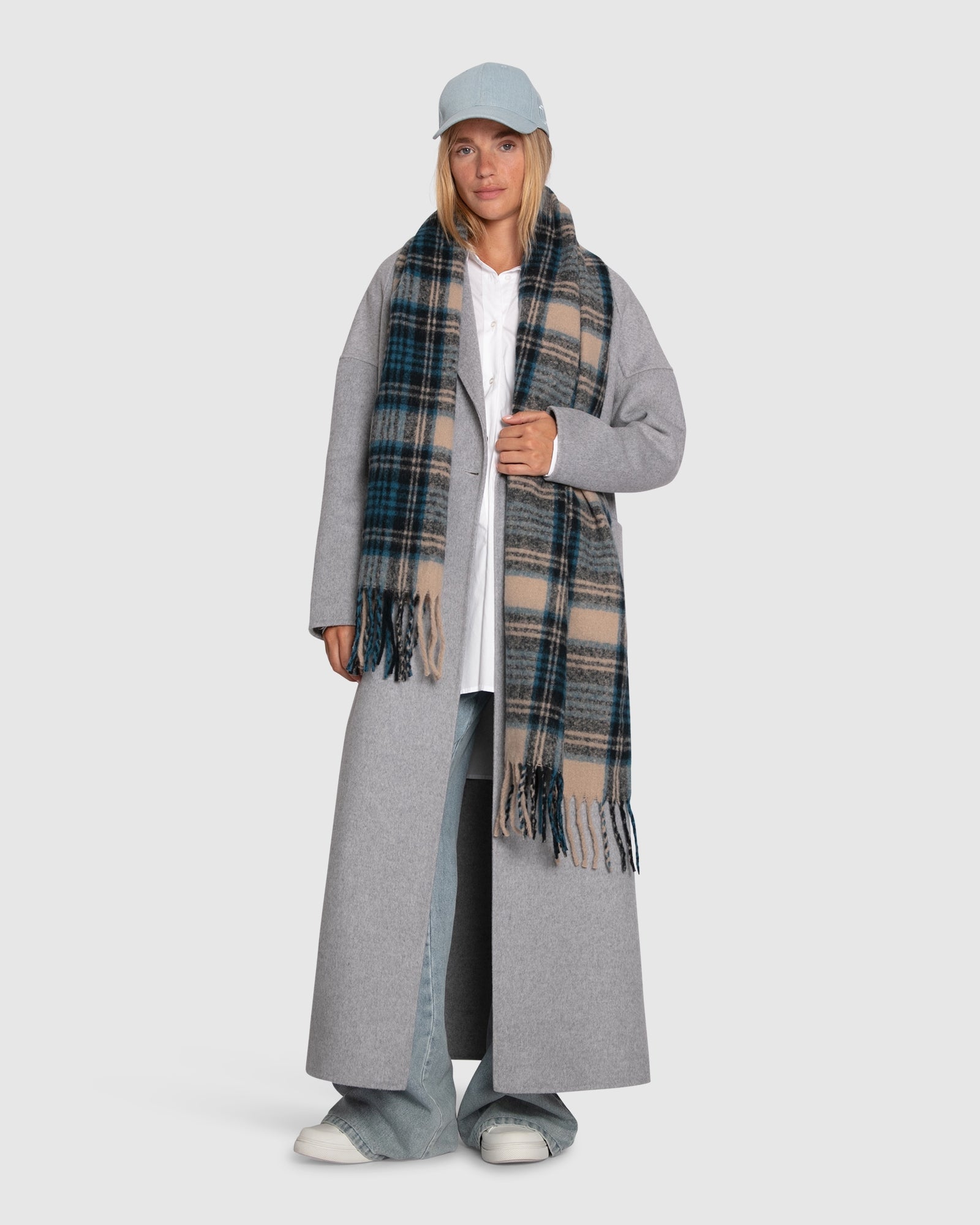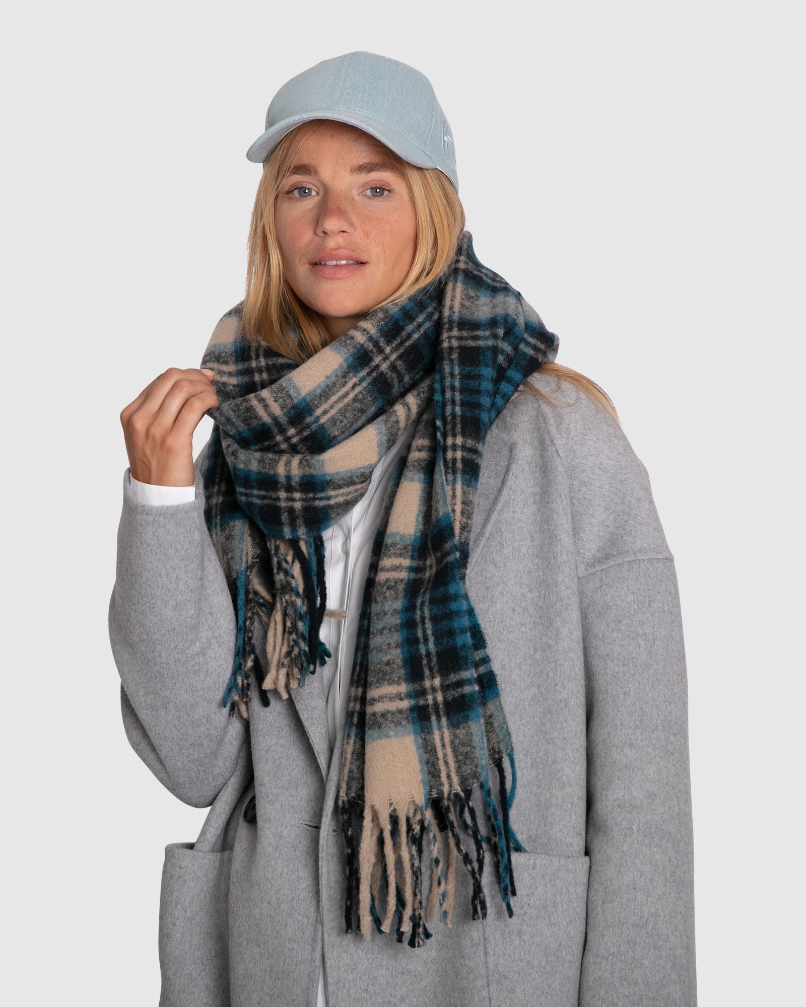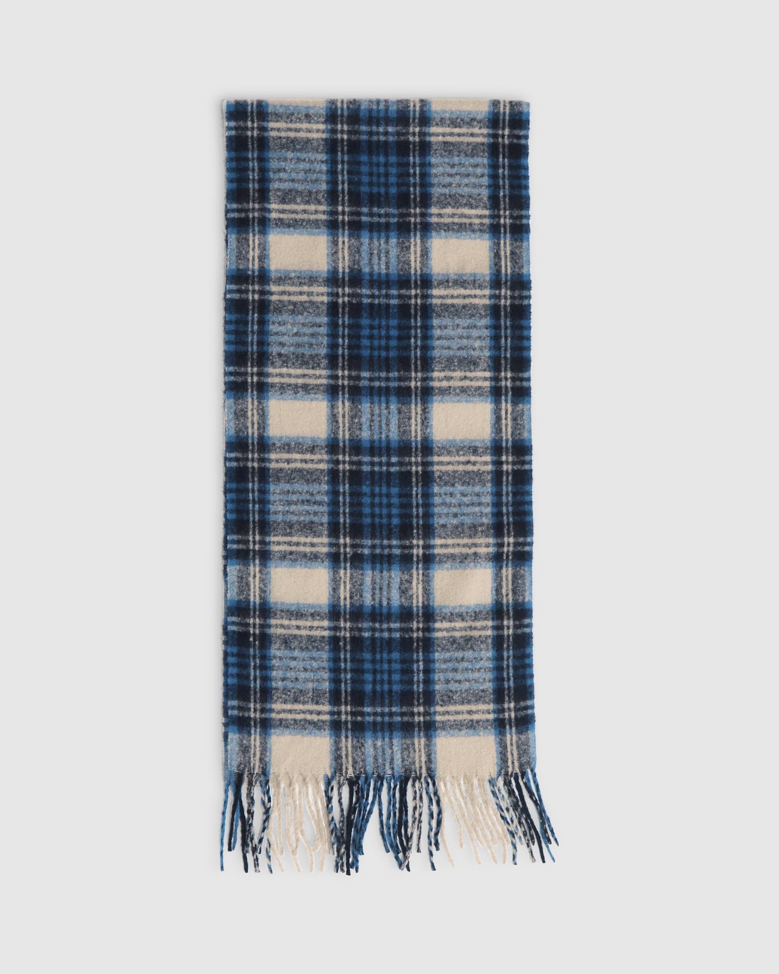 A cool and cozy essential designed to elevate your cold-weather wardrobe. Featuring a classic plaid pattern in shades of blue, from deep navy to soft, tranquil light blue, with a subtle touch of light beige. This ultra-soft knit scarf is finished with delicate fringe for a timeless, sophisticated touch. Perfect for adding warmth and style to any outfit.