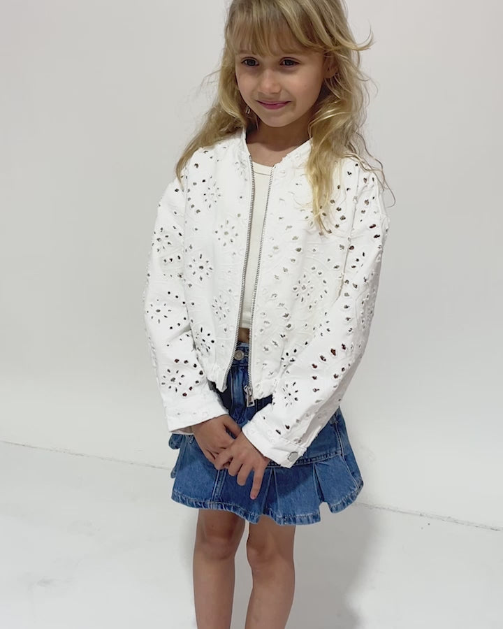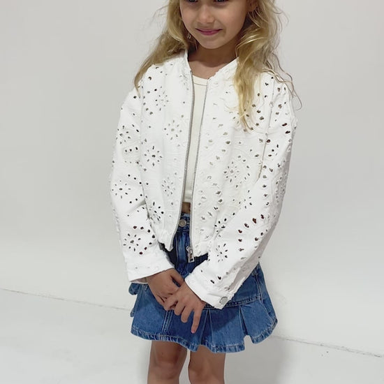 The Cool Like Me Bomber is the ultimate blend of edgy style and feminine charm. Crafted from durable twill fabric, this white bomber jacket features a sleek front zipper for easy wear and a structured fit. What sets it apart is the delicate eyelet embroidery, adding a subtle touch of elegance to the classic bomber silhouette. Perfect for layering over dresses or casual outfits, this jacket offers both versatility and style. Whether she’s heading to a weekend outing or making a statement, the Cool Like Me Bomber is a standout addition to any wardrobe.