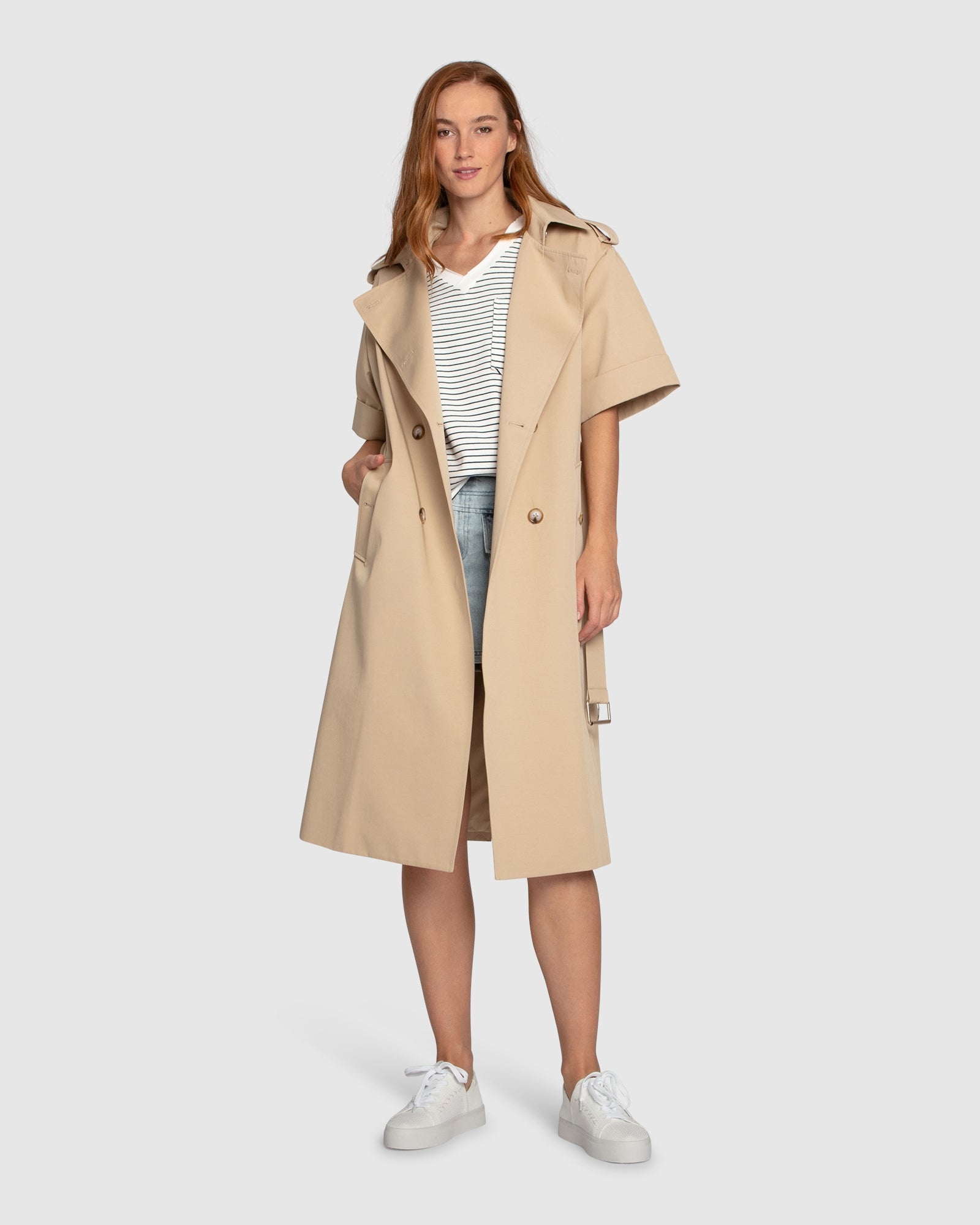 A true seasonal statement, the Dust & Daring Short Sleeve Trench Style Dress blends classic tailoring with modern versatility. Crafted from a lightweight cotton-poly blend and fully lined for comfort, this double-breasted style features short cuffed sleeves, welt pockets, and a removable waist belt to define your silhouette. Designed with a relaxed fit through the waist, it can be worn as a chic dress or layered as a short-sleeve trench coat - making it a timeless wardrobe essential.
