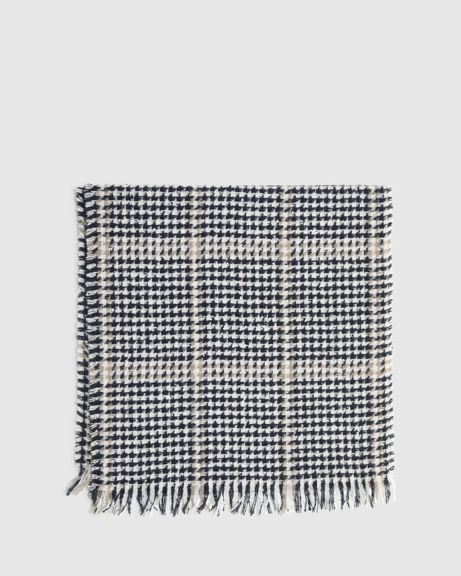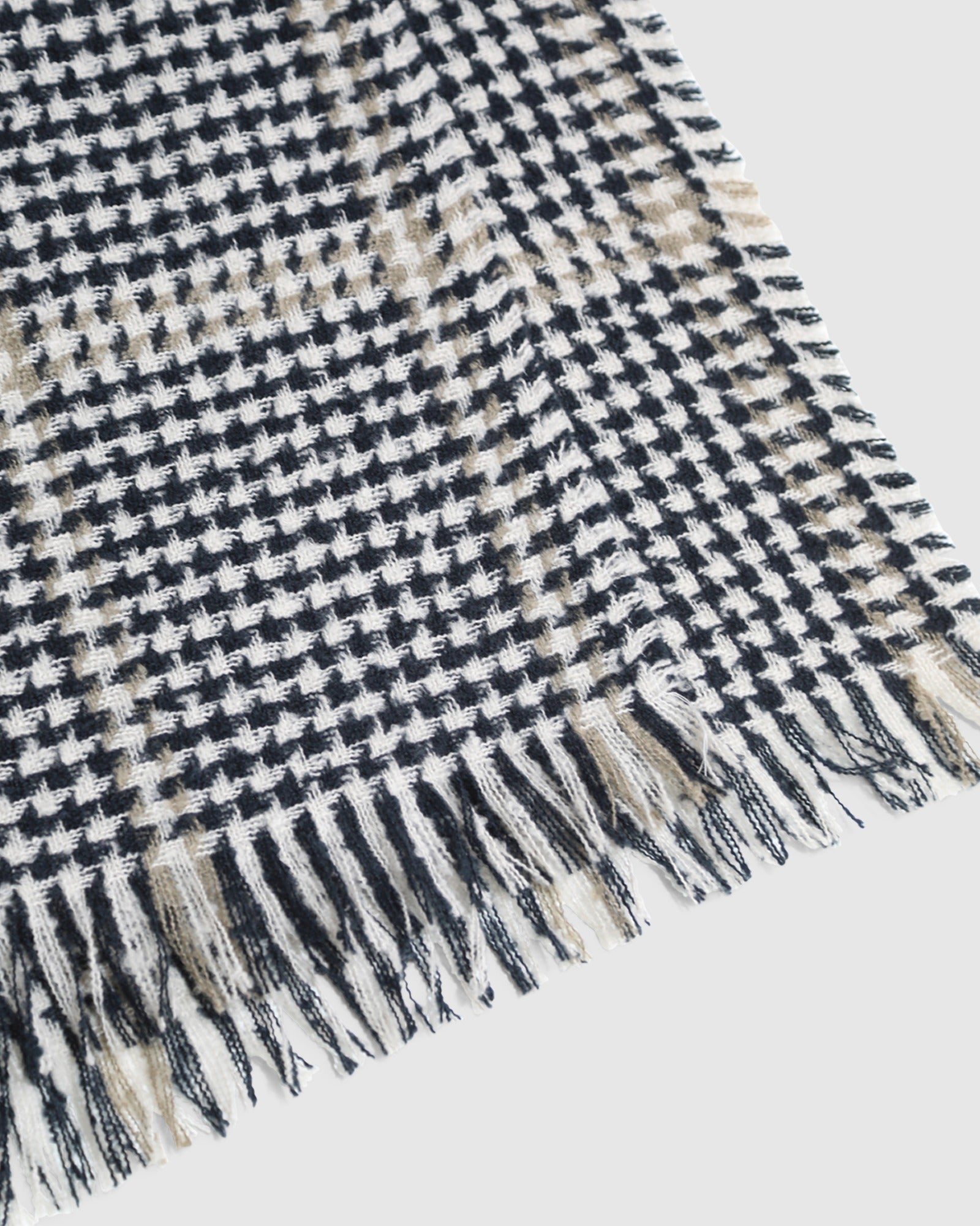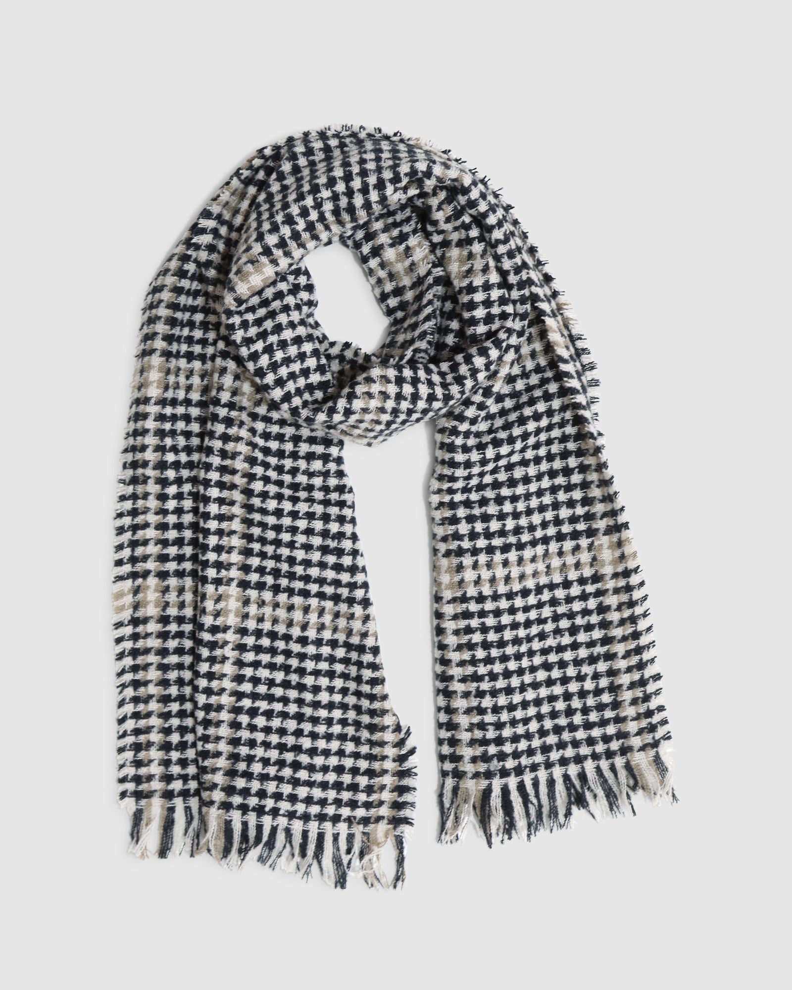 A timeless accessory featuring a classic houndstooth pattern in elegant black and beige. Designed for effortless styling, this versatile scarf complements any outerwear, adding a sophisticated touch to your look.
