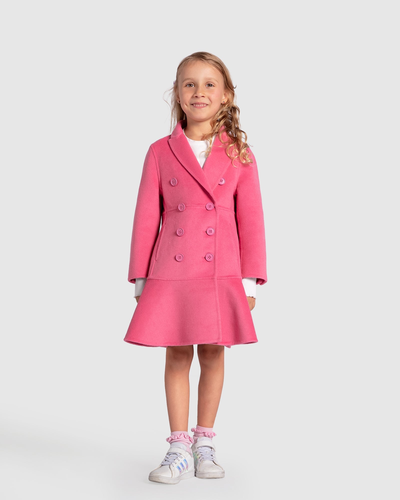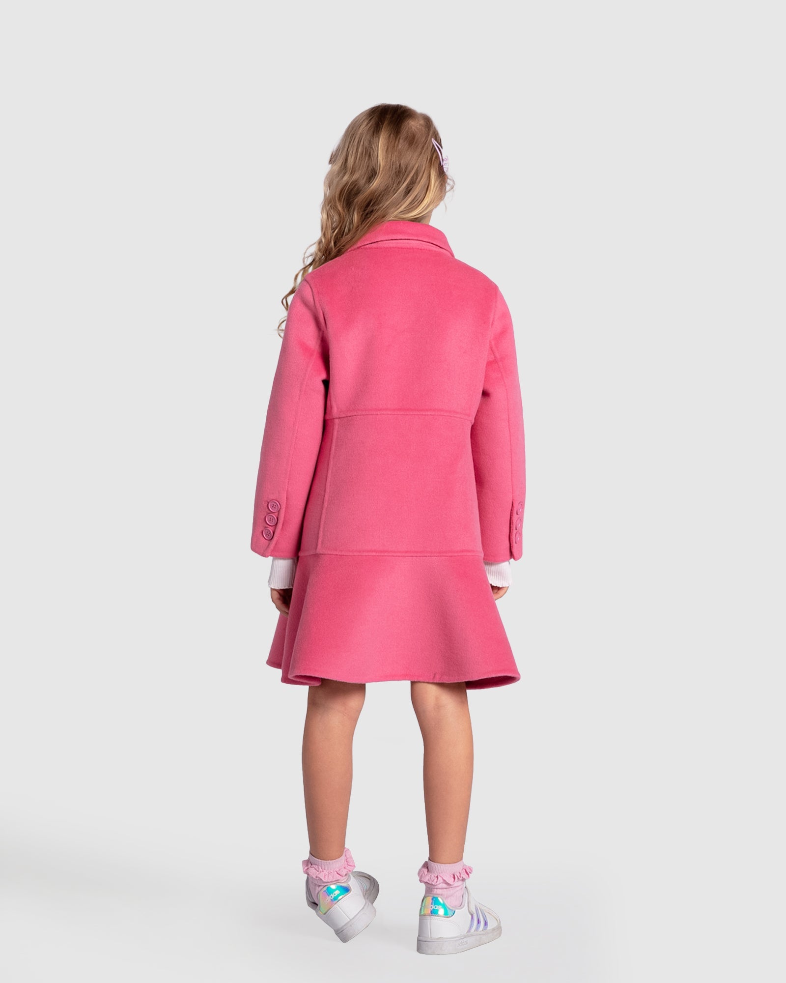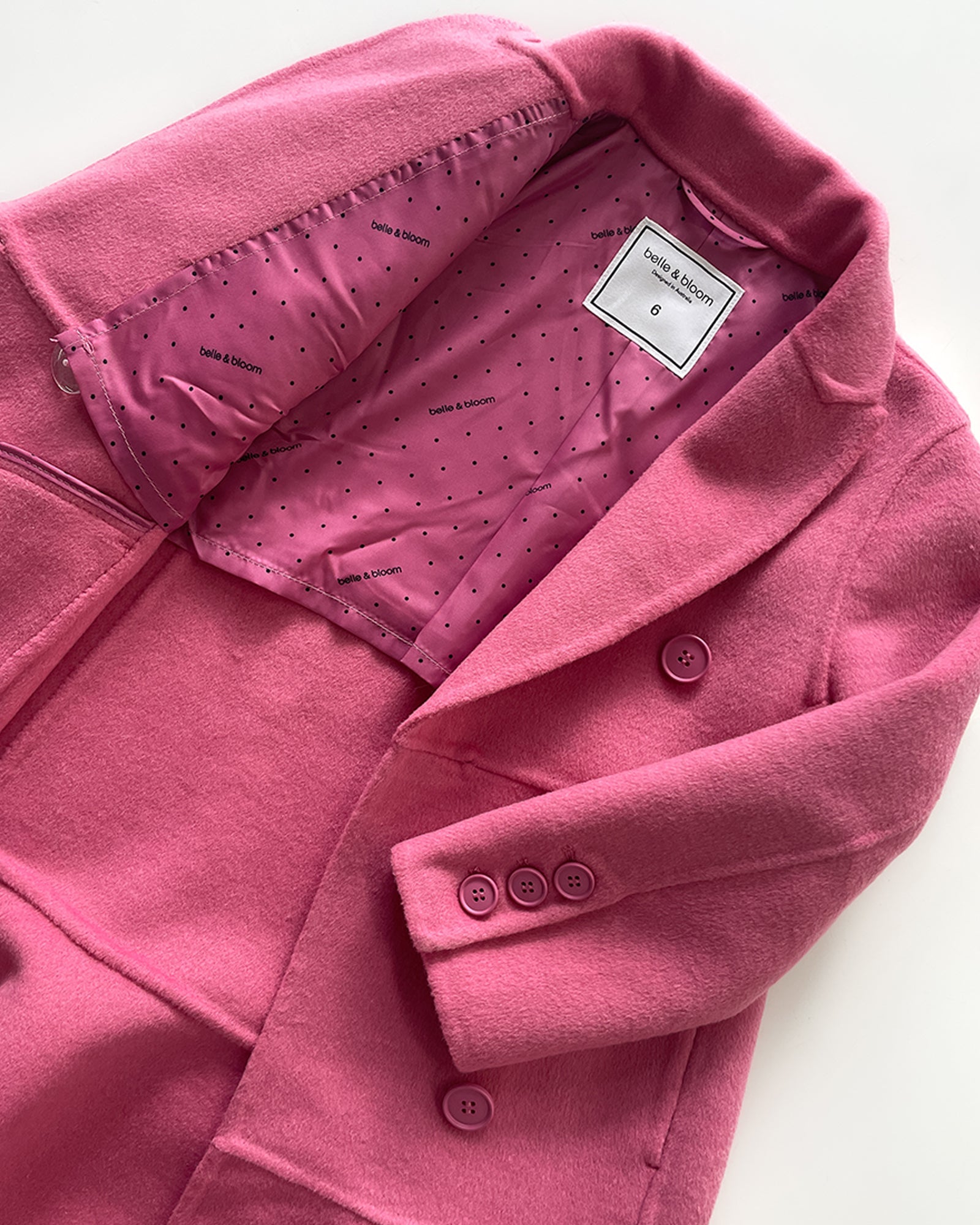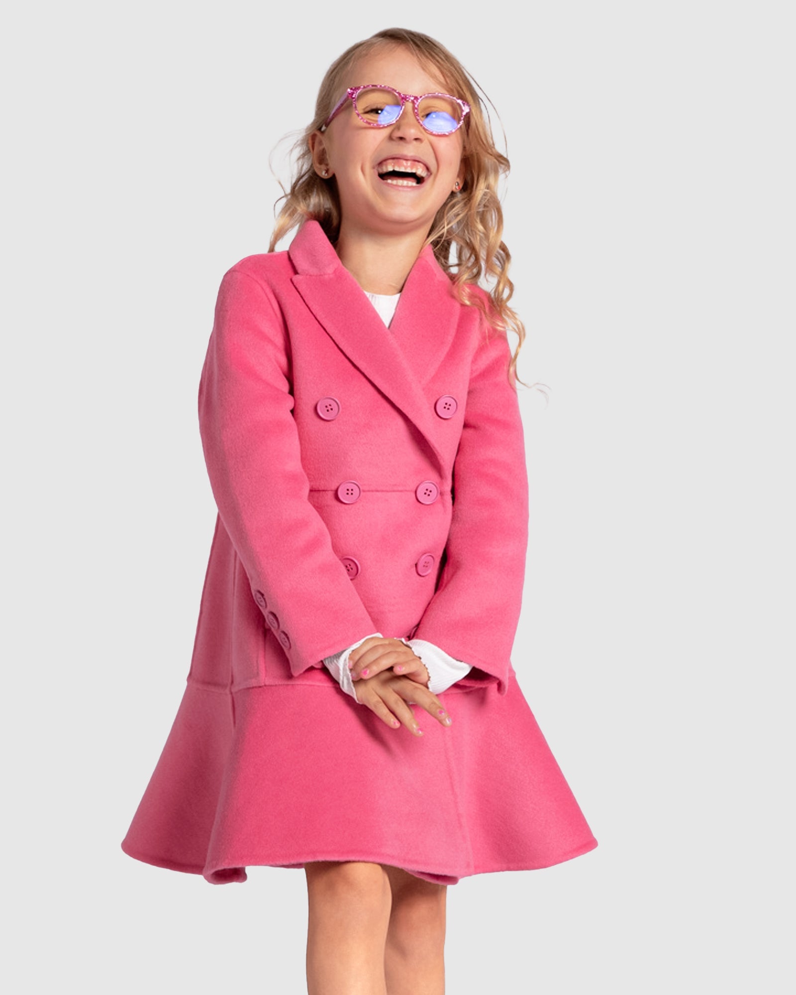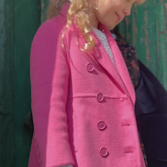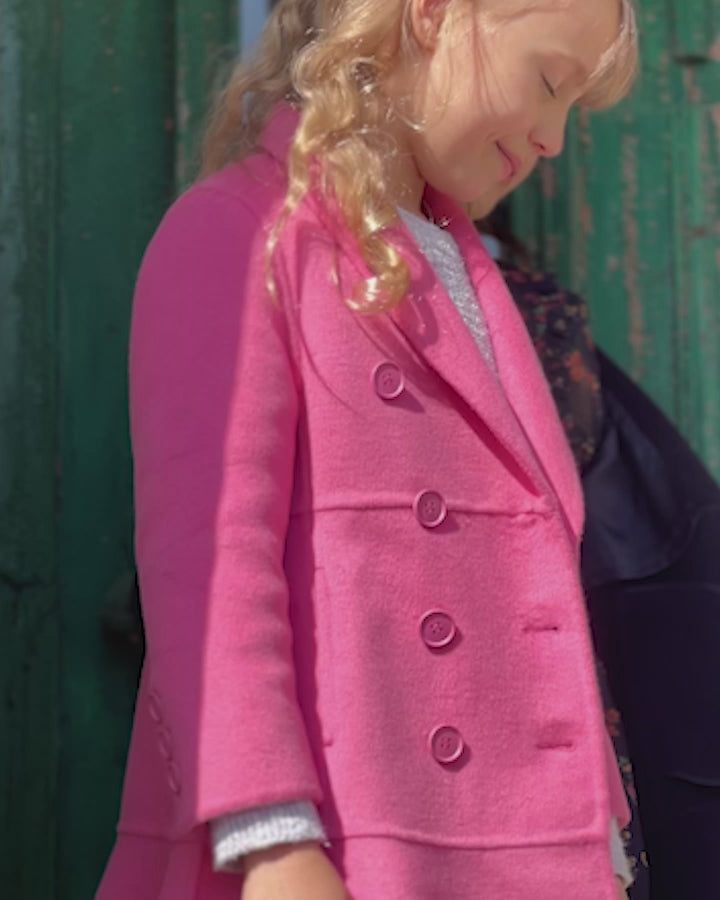 Good Manners Wool Blend Fitted Coat is a timeless wardrobe staple, crafted from our signature double-brushed wool. This hot pink coat's slender fit is highlighted by a lovely peplum detail, making it a standout piece in your child's wardrobe. The design has been carefully considered to make sure your young one looks effortlessly chic and elegant while rocking this vibrant colour.