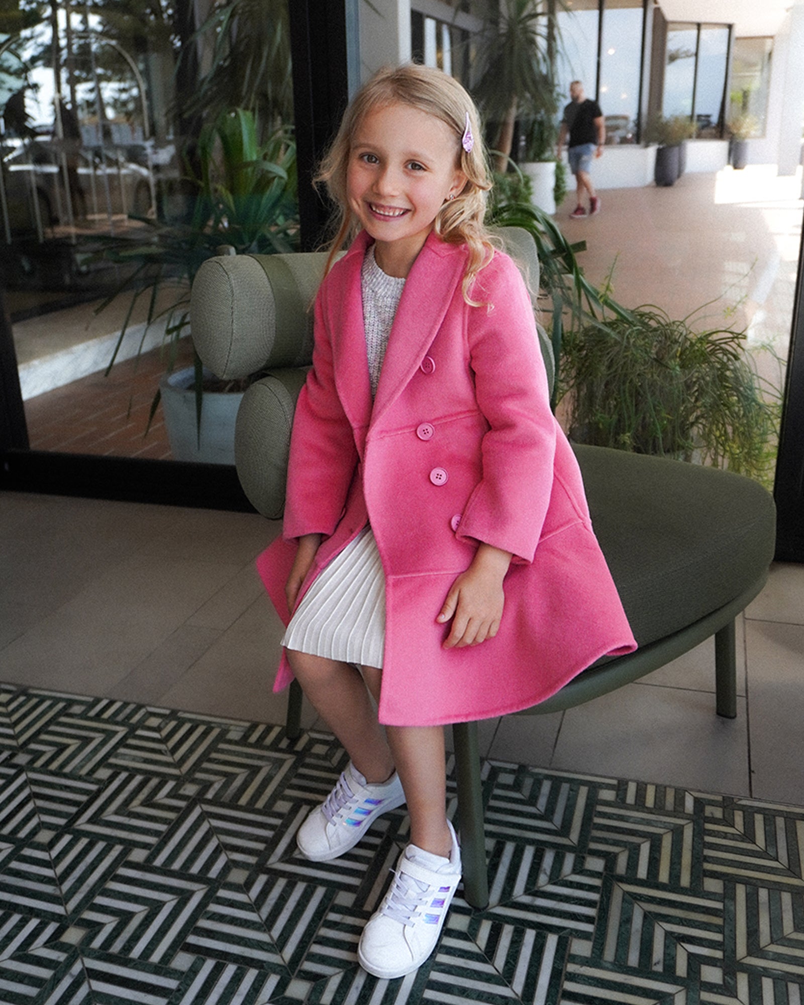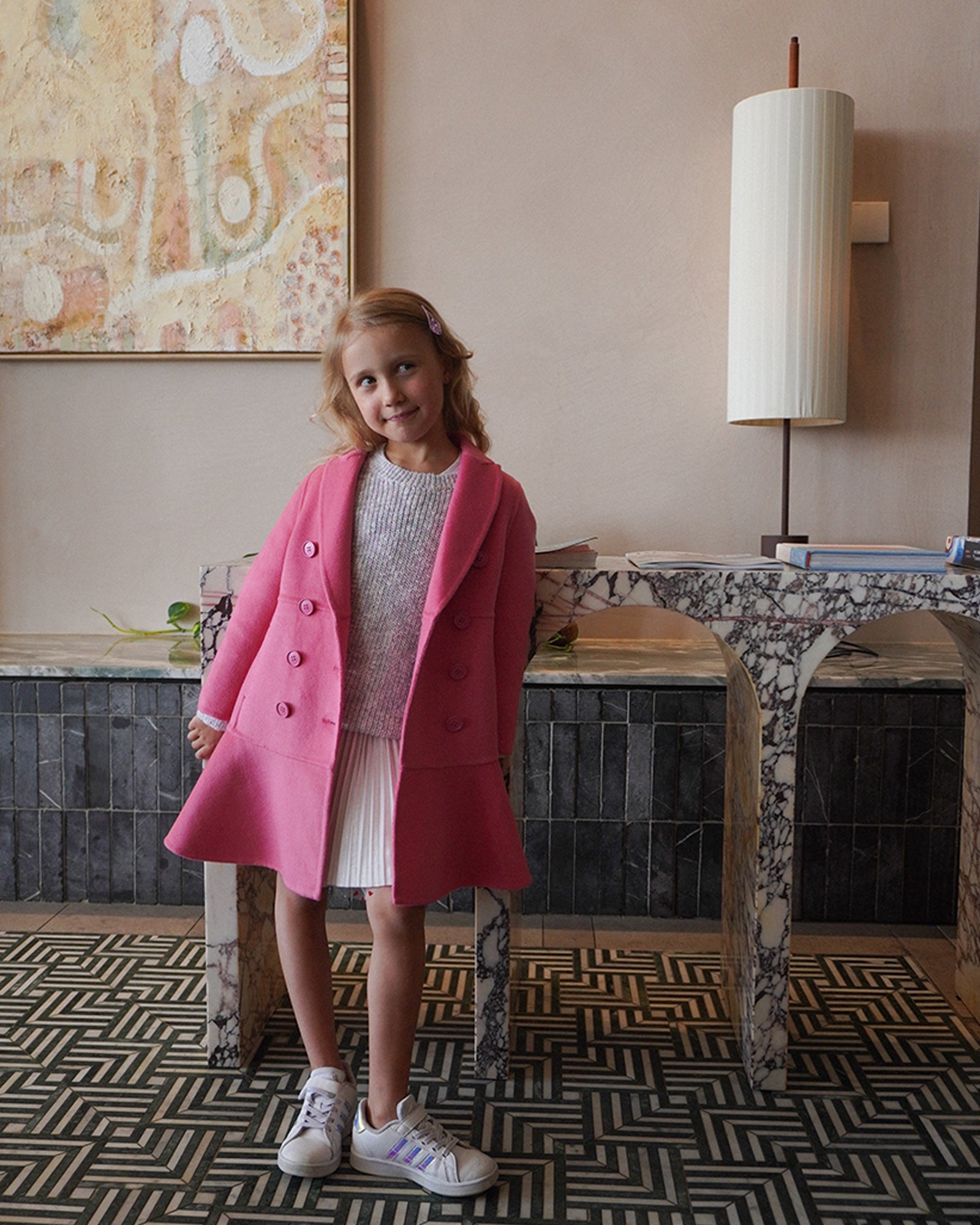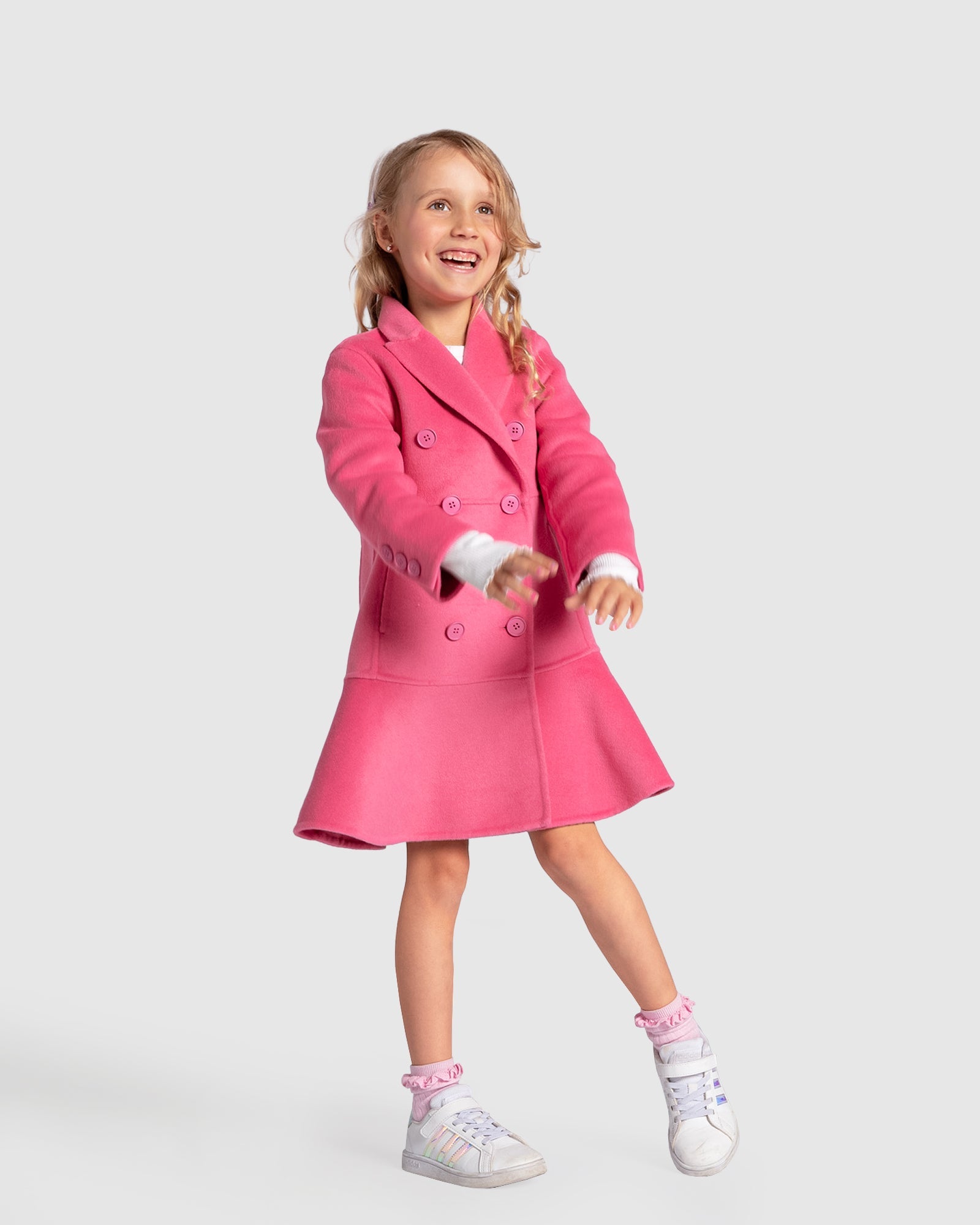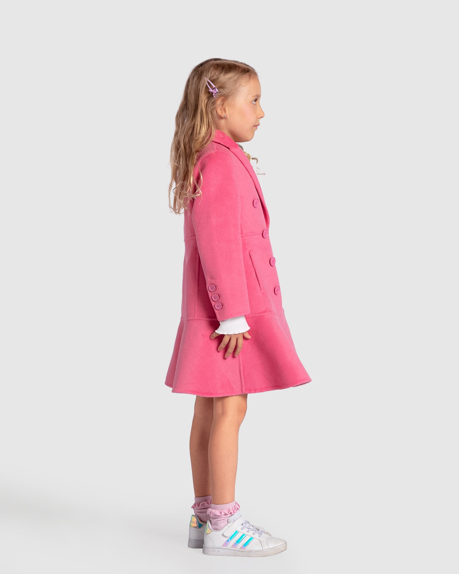 Good Manners Wool Blend Fitted Coat is a timeless wardrobe staple, crafted from our signature double-brushed wool. This hot pink coat's slender fit is highlighted by a lovely peplum detail, making it a standout piece in your child's wardrobe. The design has been carefully considered to make sure your young one looks effortlessly chic and elegant while rocking this vibrant colour.