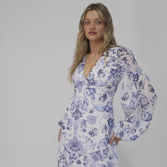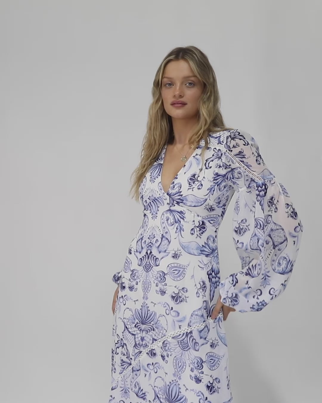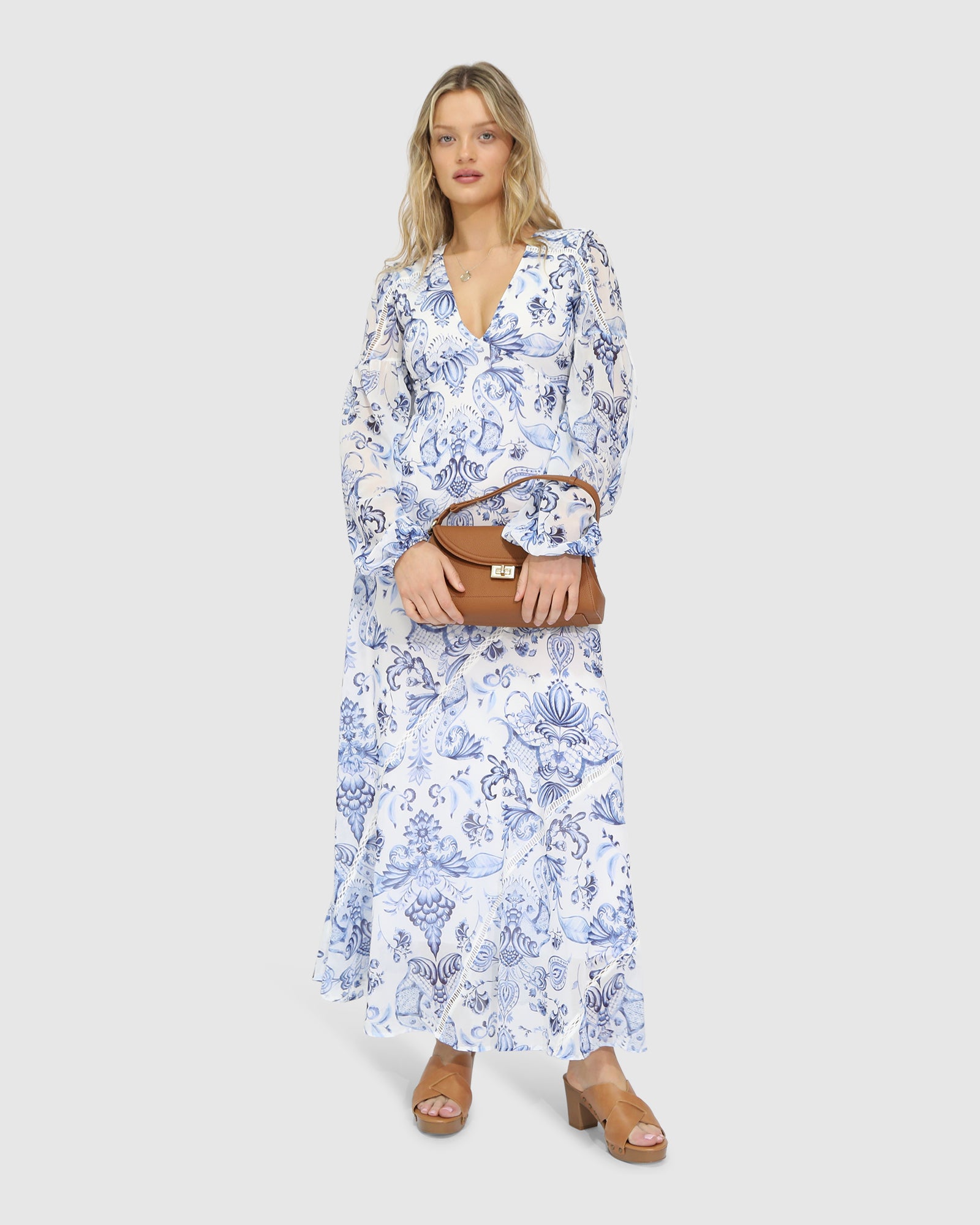 Beautifully cut on the bias, the In Your Dreams Maxi Dress hugs your curves in a feminine and bohemian print complete with billowy balloon sleeves.