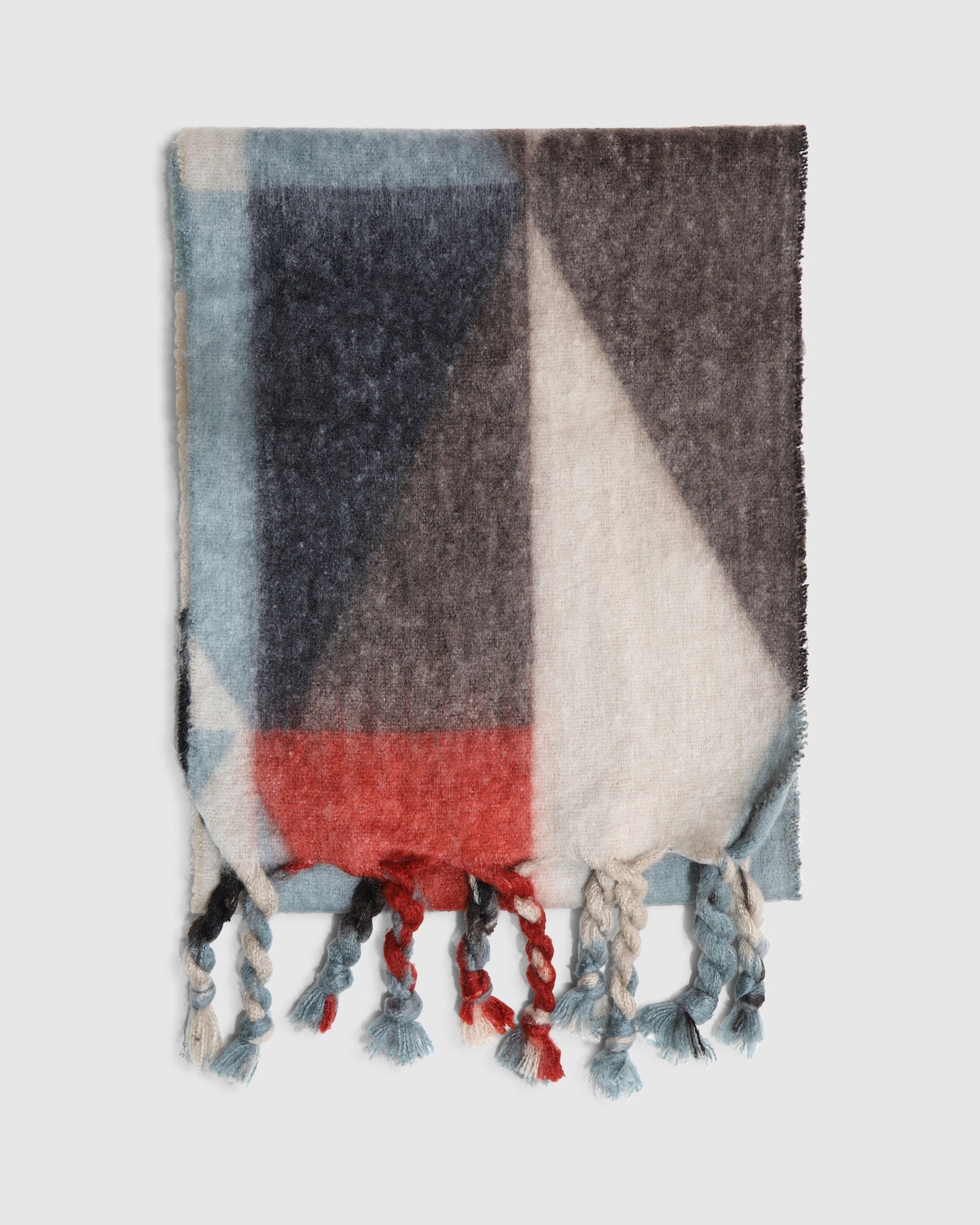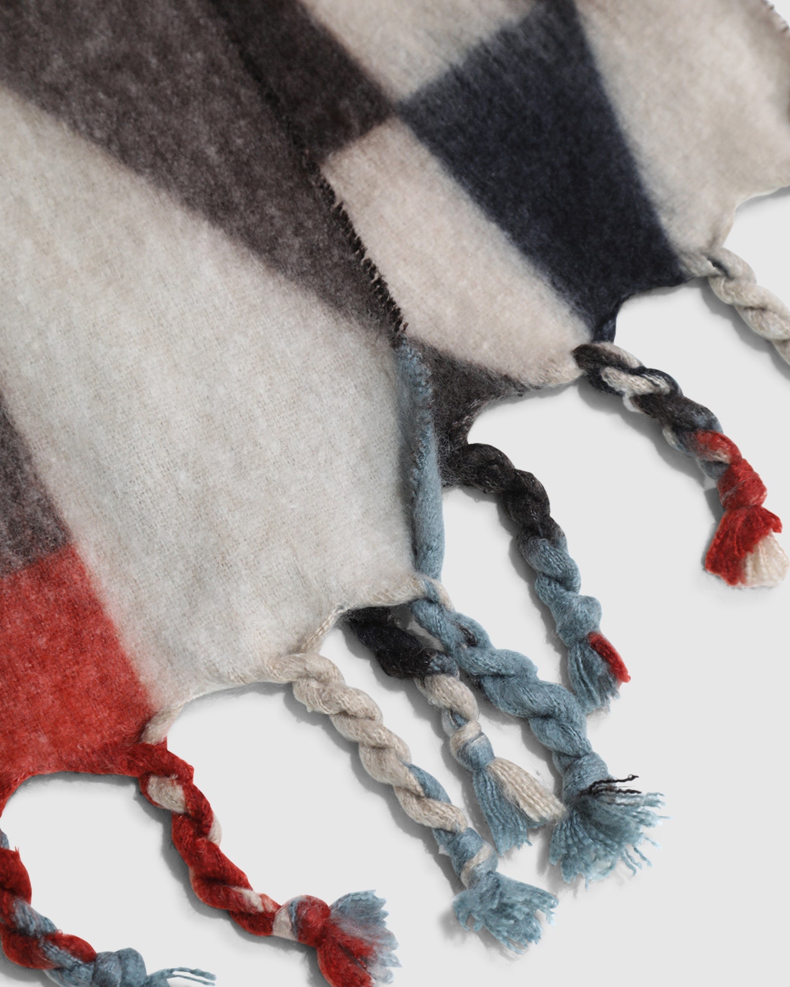 A bold and contemporary piece designed to elevate your cold-weather style. Featuring a striking, geometric pattern in sharp, defined lines, this soft scarf adds an edge to any outfit. The fringe detailing at the trim enhances the modern design with a touch of movement. A perfect accessory to make a statement while staying warm.