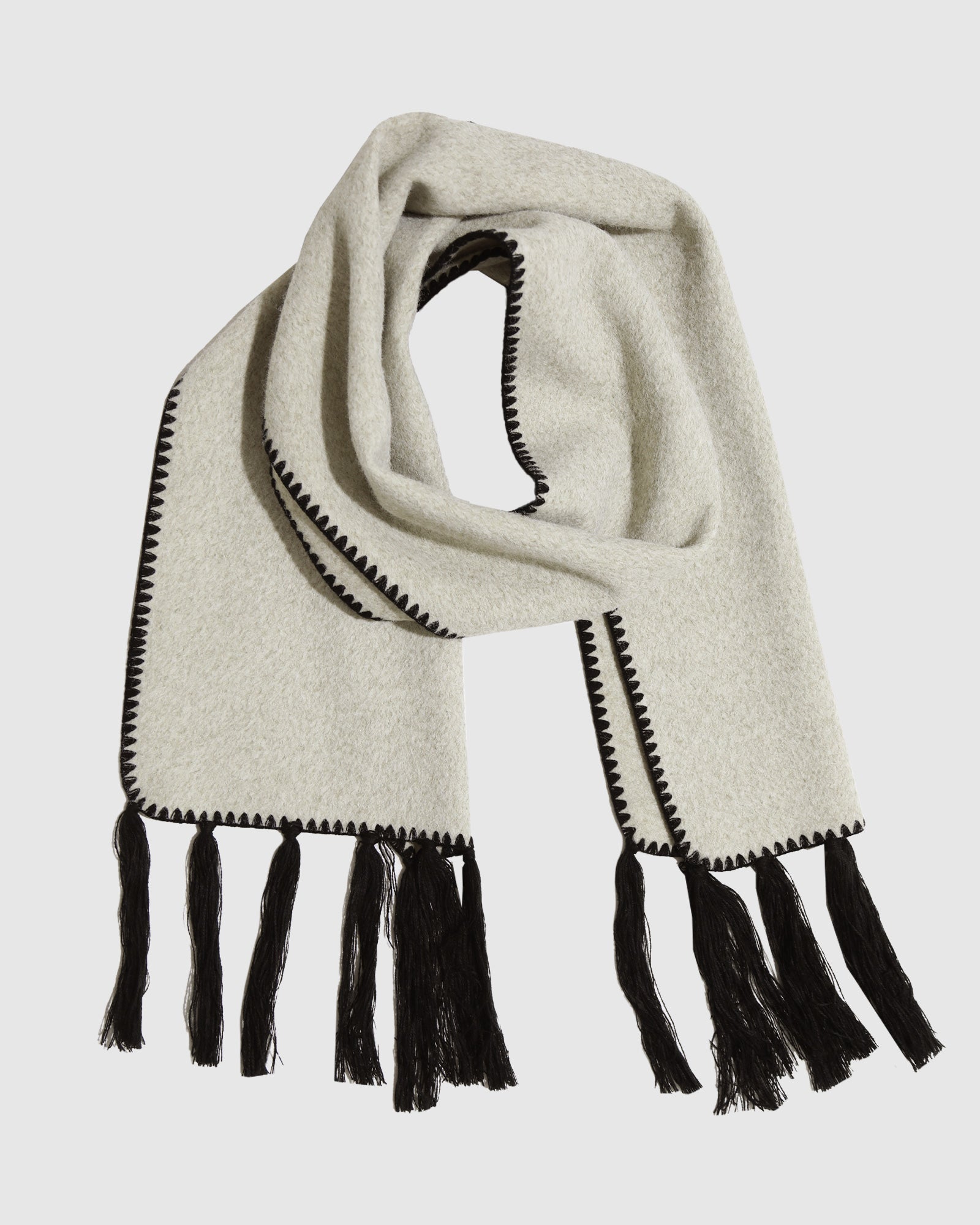 A minimalist yet striking accessory designed for both warmth and style. This plain-coloured scarf features a subtle contrast stitching around the edges, adding a modern touch to its simple elegance. Finished with delicate fringe for added texture, it's the perfect balance of understated sophistication and bold detail.