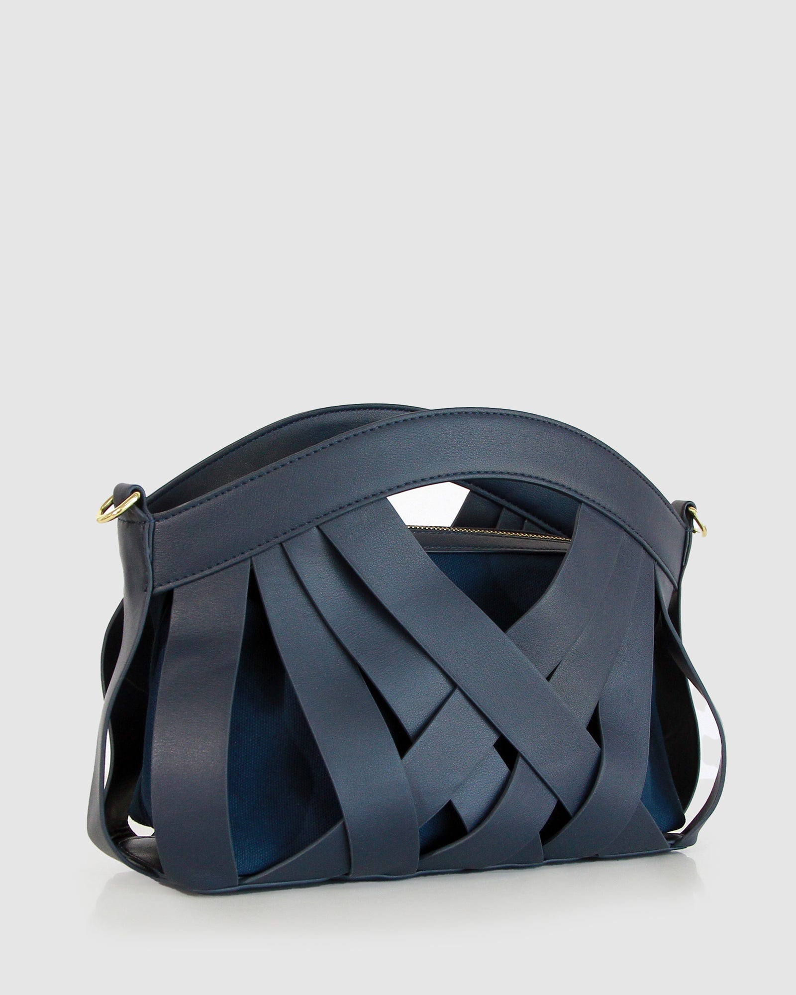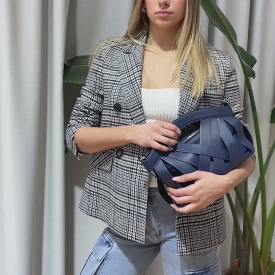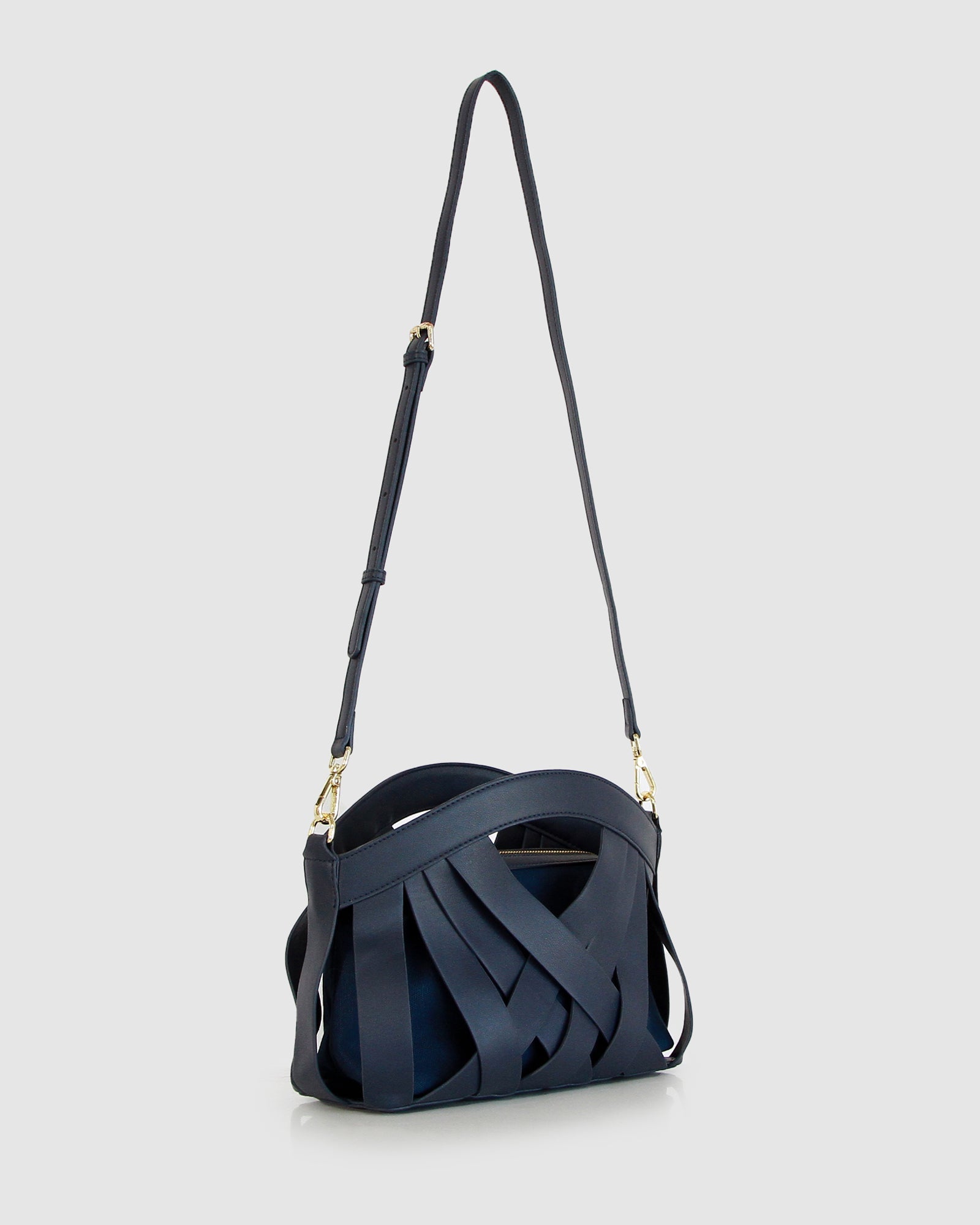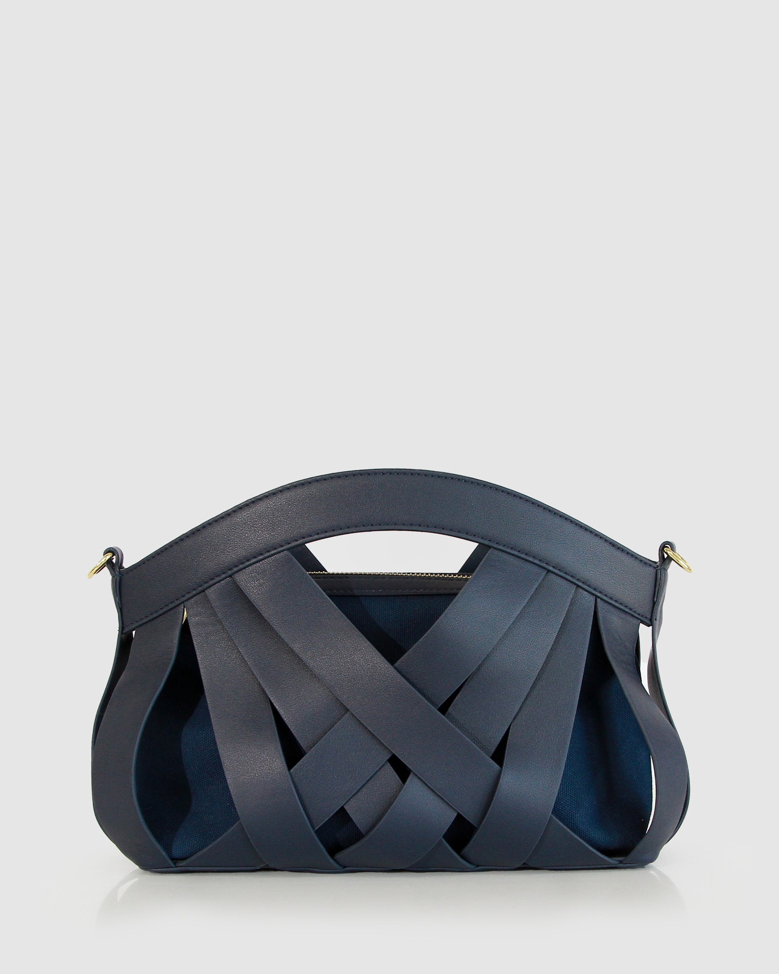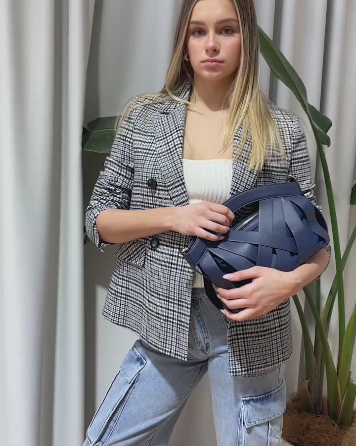 A playful take on the woven handbag trend, the One More Night Crossbody Bag is crafted from strips of leather woven in multiple directions, encasing a recycled canvas inner bag. Wear it as a crossbody during the day, or remove the strap for an evening clutch that's sure to turn heads.