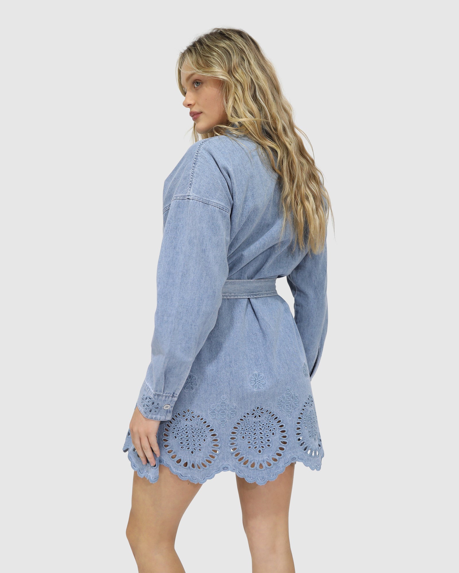 Sunday Somewhere Denim Broderie Mini Shirt Dress - Stonewash