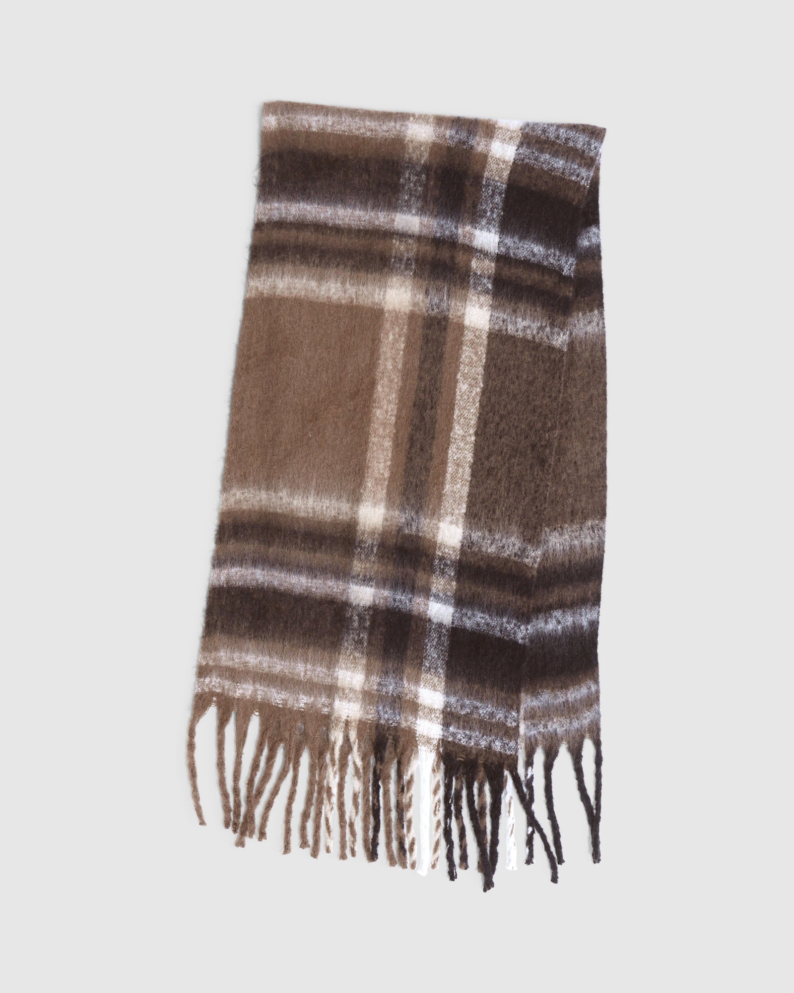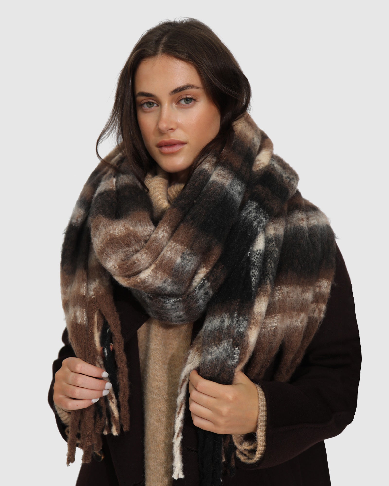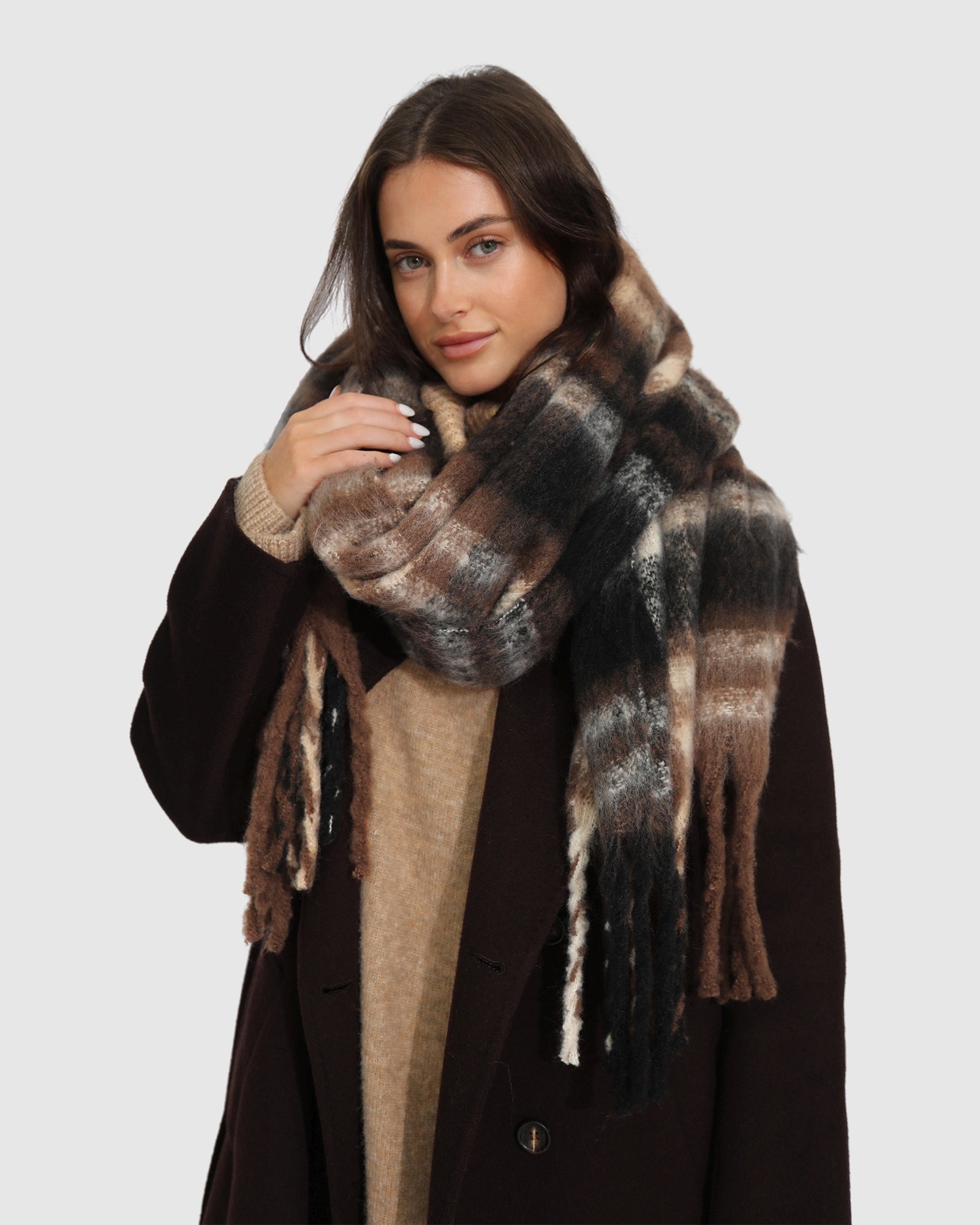 A sophisticated and versatile accessory that exudes elegance. Featuring a classic check pattern in rich chocolate browns and deep darker tones, this scarf offers a luxurious take on neutral shades. Perfect for layering, it adds warmth and depth to any outfit while keeping your look effortlessly stylish.
