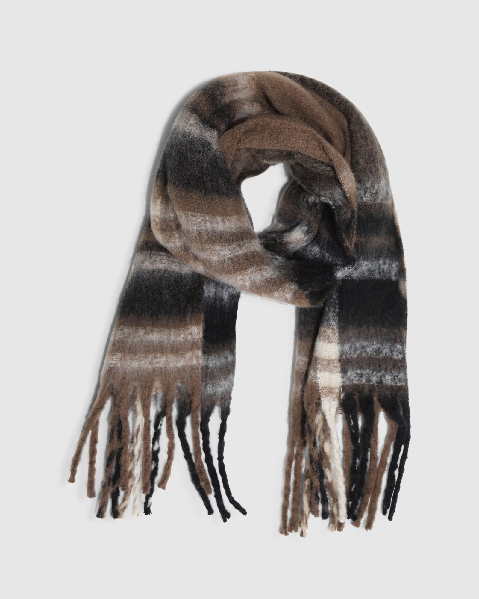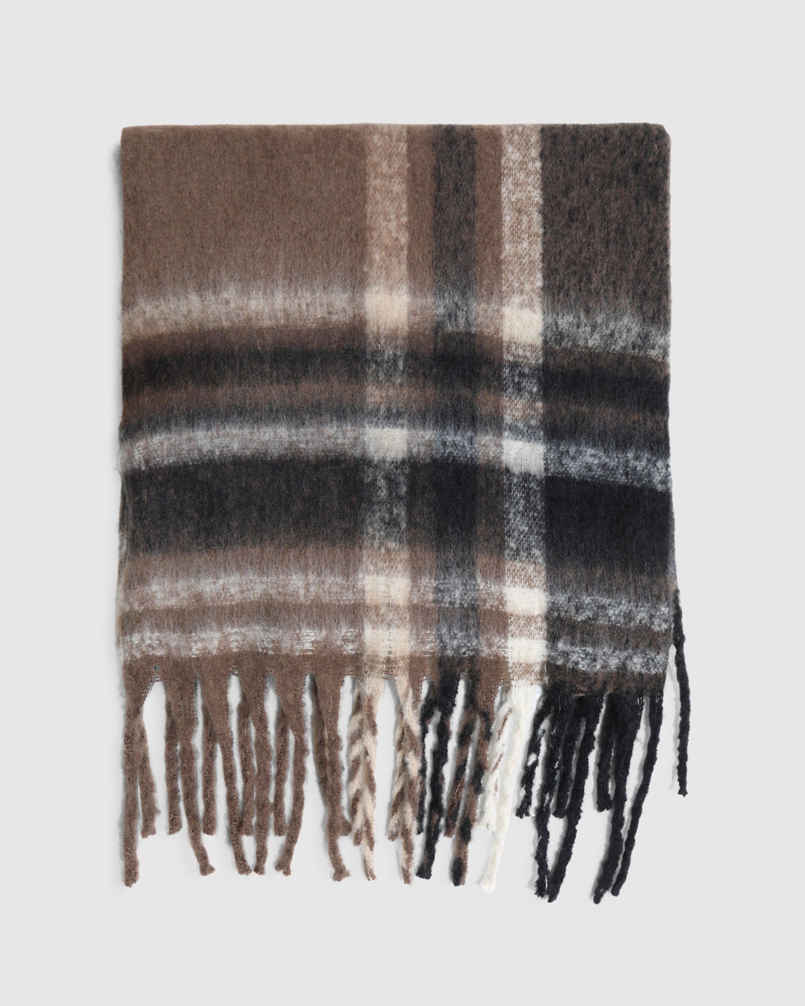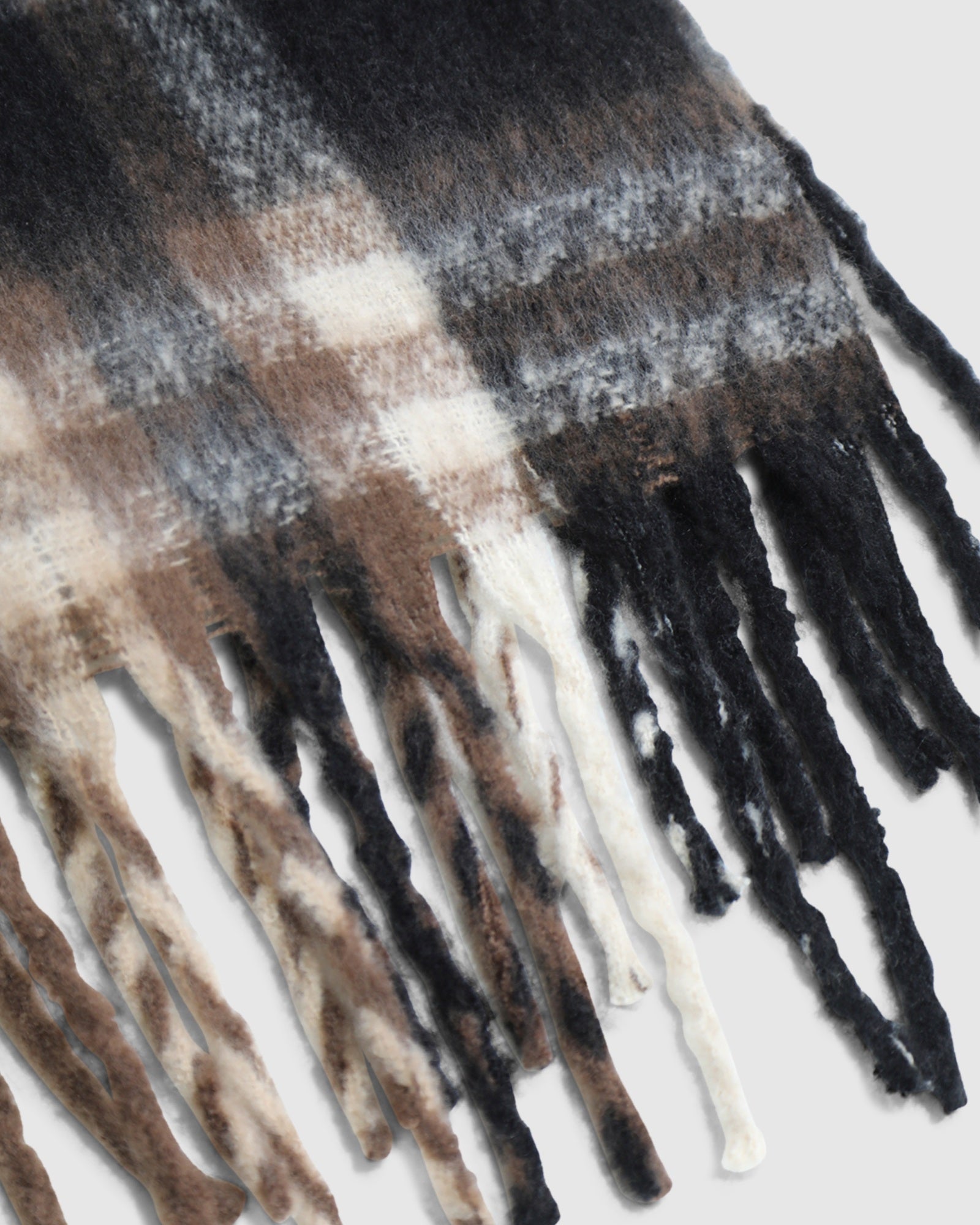 A sophisticated and versatile accessory that exudes elegance. Featuring a classic check pattern in rich chocolate browns and deep darker tones, this scarf offers a luxurious take on neutral shades. Perfect for layering, it adds warmth and depth to any outfit while keeping your look effortlessly stylish.